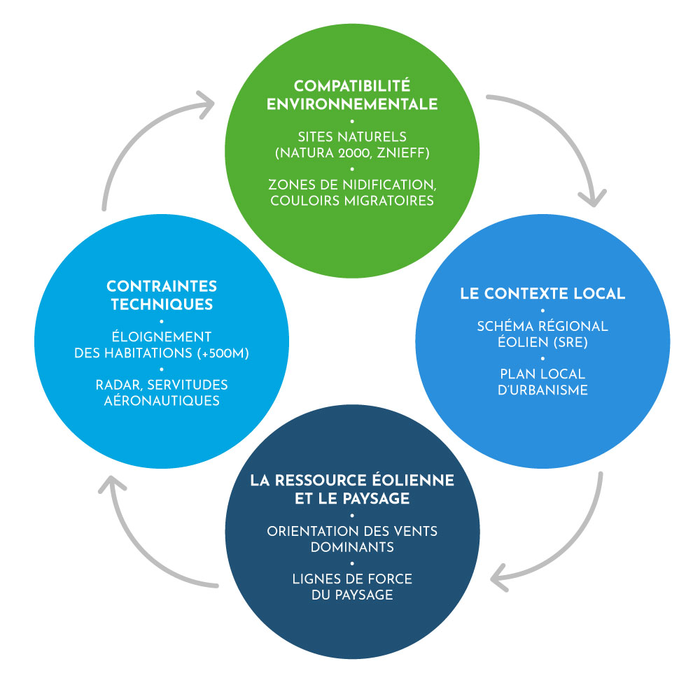Le contexte local est pris en compte dès la phase amont du développement d’un projet éolien. Pendant la phase de prospection, tous les critères présentés par le schéma sont analysés pour identifier des sites où ces critères convergeront, ce qui définira des zones favorables à l’implantation des éoliennes.