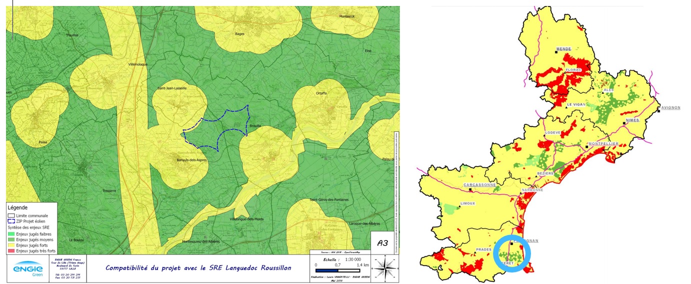 Le choix de la zone d’étude s’est fait en fonction de ce schéma régional éolien du Languedoc-Roussillon, dont la carte des enjeux est présentée ci dessous :
